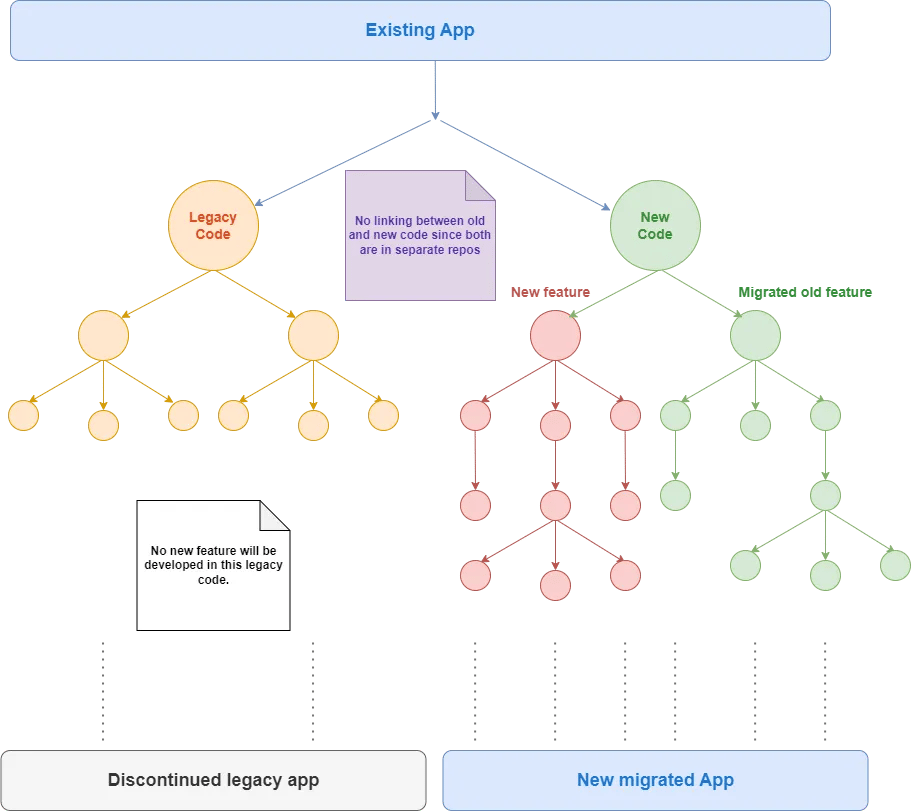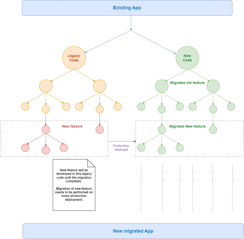 Like other ways, this too has its shortfalls. The major challenge is to keep migrating the features developed in the legacy systems as soon as they are deployed on production.