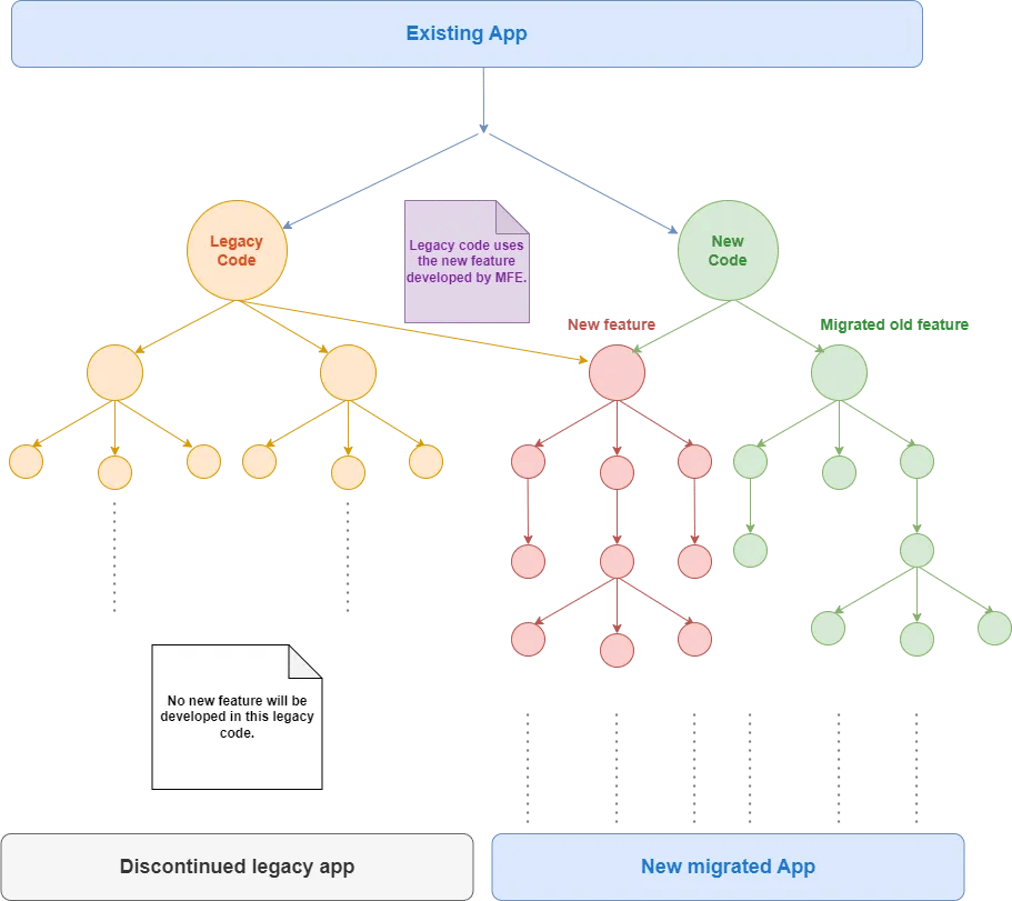 The Microfrontend (MFE) approach involves implementing the new features on the updated version while integrating them with the existing Angular version within an MFE architecture. Eventually, all the features will then transition to the new framework.